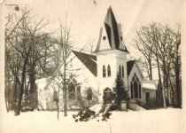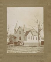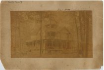 First Methodist Church building - Black and white photograph of the first Methodist Church, which was built in 1891. The photograph is attached to a beige mat with a textured design.