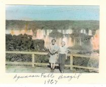 Beall sisters by the falls in Brazil - Hand colored photo of the Beall sisters, Yolande and Cornelia, by the falls in Brazil, 1967.