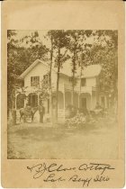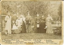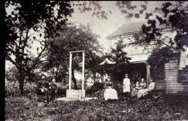 Cloes house southwest view with family - Southwest side of Cloes house on Bluff Road. Starting at far left: Ben Cloes, Augustus (Gus) Cloes, Lizzie Cloes (Mrs. Philip Hole of Deerfield) , Grace Cloes (Mrs. Stedman) , Mrs. John Cloes with child, Carrie Cloes (Mrs. Abe Barrows). This house was later the site of the Stearn's house.