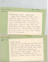 Identifying information cards used with picture of John and Catherine Cloes, son Ben and family homestead and brickyard in a Lake Bluff exhibition undated. The brickyard started in 1885 by Catherine and run by Mr. Ostrander.