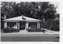 Two black and white photos of the Lake Bluff Pharmacy at 100 East Scranton Avenue. The original pharmacy located at 40 East Scranton, was owned and operated by Graham Munch. In February, 1958 Munch retired and donated the building to the library on the condition that he retain his residence on the second floor. Munch died ten months later, on December 7, 1958. When Munch retired, he sold his business to his assistant, Howard Willms, who built this brick building just east of the earlier frame building. The brick pharmacy remained in that location until the mid-1970s, when Willms built a brand-new pharmacy. The new Lake Bluff Pharmacy closed in the late 1990s and other businesses now occupy both buildings. |